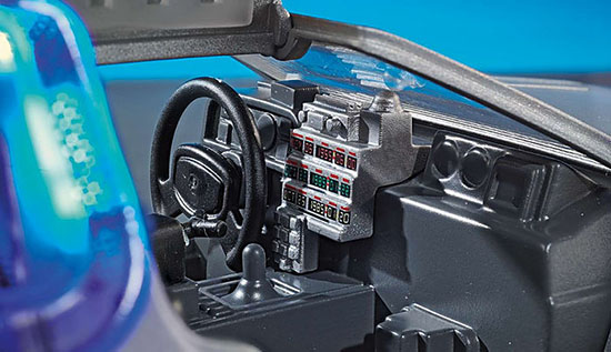 Au niveau équipement, la voiture est plutôt bien dotée puisqu’elle embarque pas mal d’élements du film. On trouve bien sûr le convecteur temporel dans l’habitacle, mais aussi un emplacement à l’arrière de la voiture pour insérer le plutonium.