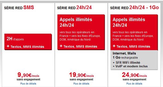 – RED 24/24 – 1Go à 24,90€ reprend toutes les caractéristiques de l’offre précédente à laquelle ont été ajoutés l’accès à internet (fair use de 1 Go rechargeable au prix de 5€ les 250 Mo), l’accès aux hotspots SFR WIFI et la possibilité d’utiliser la VOIP et le mode modem.
