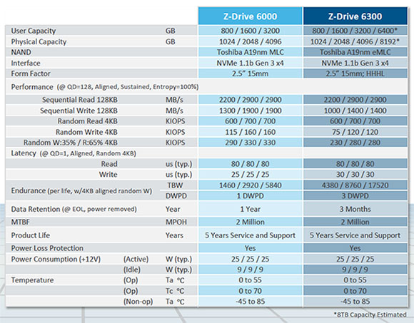 – Z-Drive 6300 : Ce modèle embarque de la mémoire NAND Flash eMLC Toshiba A19nm. Il est décliné en quatre variantes : 1 To, 2 To, 4 To et 8 To. Ses débits séquentiels peuvent atteindre au maximum 2.900 Mo/s en lecture et 1.400 Mo/s en écriture.