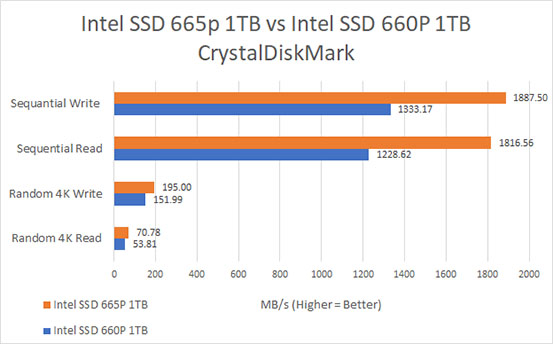 Comme on peut le voir sur le graphique ci-dessous, ce changement a une incidence notable sur les performances du disque puisque d’après les premiers tests réalisés par nos confrères de Legitreviews, il sera possible d’atteindre des taux de transferts de 1.816 Mo/s en lecture et de 1.887 Mo/s en écriture avec la version 1 To du Intel 665p.