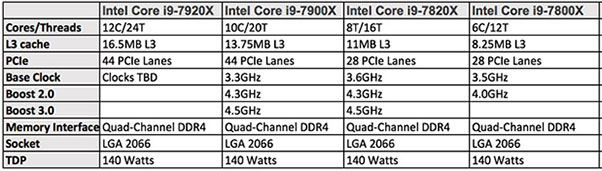 Le processeur le plus puissant de cette nouvelle gamme, le Core i9-7920, serait doté de 12 coeurs, de 24 threads et de 16,5 Mo de mémoire cache L3. Ses fréquences de fonctionnement ne sont pas connus pour le moment mais à priori vu que les autres modèles pourront atteindre 4,3 voire 4,5 GHz en boost, celui-ci devrait faire au moins aussi bien si ce n’est mieux.