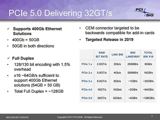 Mieux encore, le PCI Express 5.0 est d’ores et déjà à l’étude. Et une fois encore les débits seront multipliés par deux par rapport à la version précédenet ce qui donnera 32 GT/s et jusqu’à 128 GB/s en PCI Express 5.0 16x. A noter que le PCI Express 5.0 ne devrait pas voir le jour avant 2019.