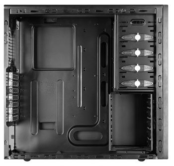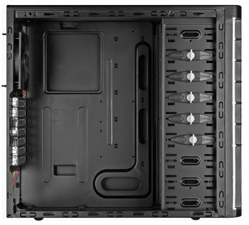Last but not least, le Nightfall possède un ventilateur de 120mm à LED en face avant, cinq baies 5,25" et une cage amovible pour disques durs dans laquelle cinq HDD de 3,5 pouce peuvent prendre place.