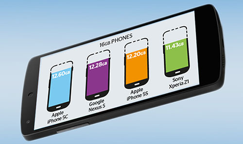 Comme on peut le voir sur l’infographie ci-dessous, un smartphone annoncé avec une capacité de stockage de 16 Go n’offre généralement que 12 Go d’espace disponible pour les meilleurs d’entre eux, moins de 11 Go pour certains et même carrément moins de 9 Go disponible pour d’autres comme le Galaxy S4 de Samsung.