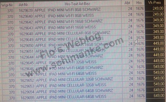 L’iPad Mini serait ainsi proposé en version WIFI à 249€ avec une capacité de 8 Go, 349€ avec une capacité de 16 Go, 449€ avec une capacité de 32 Go et 549€ avec une capacité de 64 Go. Les version WIFI + cellulaire (3G ou 4G LTE ?) coûteraient pour leur part 100€ de plus.
