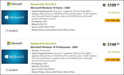 Au rang des rumeurs, voici une autre information qui risque d’en intéresser plus d’un, notamment ceux qui ne sont pas éligibles à la mise à jour gratuite de Windows 10 car ils ne disposent pas de Windows 7, 8 ou 8.1. Le site marchand américain Newegg vient en effet de révéler (par inadvertance ? à moins que ça soit une fuite organisée…) le prix de vente des versions OEM de Windows 10 Home et Windows 10 Pro.