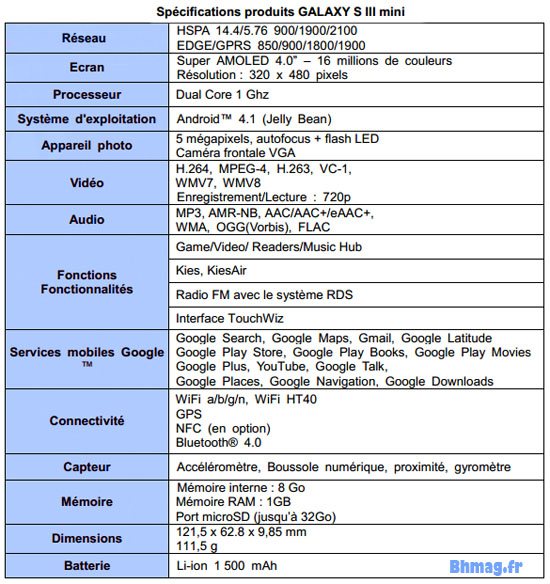 Mise à jour : Le tableau ci-dessous indique une résolution de 320 x 480 pixels. Il s’agit bien évidemment d’une erreur de l’agence de presse de Samsung (je ne sais pas ce que l’on pourrait faire avec une telle résolution). La résolution du Galaxy S3 Mini est de 800 x 480 pixels. Merci à Timmy de nous l’avoir signalé dans les commentaires.
