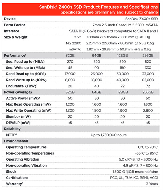 Le fabricant SanDisk annonce l’arrivée des SSD Z400S aux formats 2,5 pouces, mSATA et M.2. Chaque version est déclinée en quatre capacités de stockage : 32 Go, 64 Go, 128 Go et 256 Go. Du côté des performances, on peut s’attendre à atteindre au maximum des débits de 520 Mo/s en lecture et de 330 Mo/s en écriture.