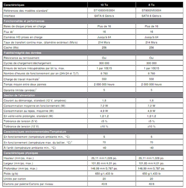 Vous l’aurez compris, ces deux disques durs sont destinés en priorité aux professionnels de la surveillance vidéo. Couverts par une garantie de cinq ans, ils sont disponibles en deux capacités de stockage : 8 To et 10 To. La version 8 To est annoncée au prix de 339€ tandis que la version 10 To atteint 429€ avec à chaque fois deux ans d’abonnement au service de récupération de données Seagate Rescue.