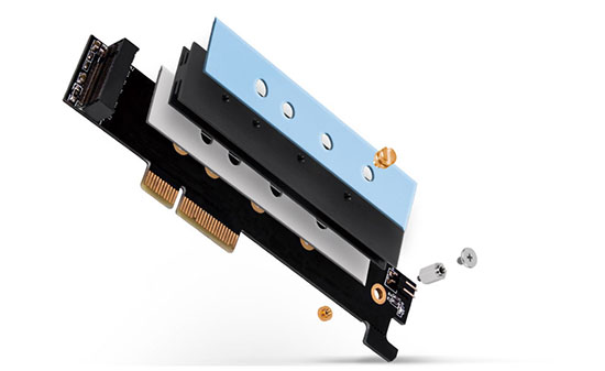 Le fabricant Silverstone propose un produit intéressant qui porte le nom de ECM26. L’engin est en fait un adaptateur qui permet d’utiliser un SSD au format M.2. en le branchant dans un connecteur PCI Express 4x. L’intérêt de cet appareil est de pouvoir utiliser ou recycler un SSD M.2. dans un ordinateur qui n’a pas d’emplacement M.2.