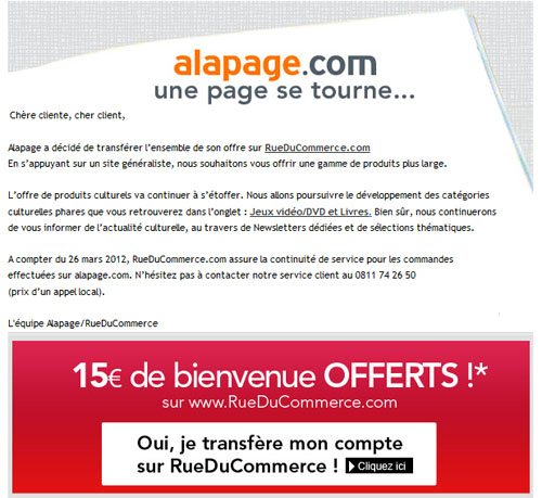 Notons également que les clients d’Alapage ont reçu par mail un message du même type les invitant à transférer leur compte client et à bénéficier au passage d’une offre de bienvenue de 15€ de remise (offre valable pour 250€ d’achats et ce jusqu’au 30 avril 2012).