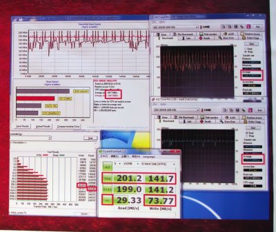 Des tests de débits réalisés sous CrystalMark ont révélés des débits de respectivement 201 et 141 Mo/s en lecture et e écriture.