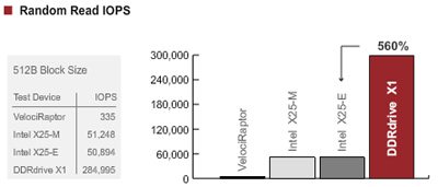 L’usage combiné de mémoire DDR et mémoire flash permettrait, d’après DDRDrive, d’augmenter considérablement le nombre d’entrées et sorties par seconde (IOPS). Ainsi le DDRDrive X1 supporterait 284.995 IOPS en lecture alors que d’autres modèles, comme exemple les SSD X25-E d’Intel atteindraient au mieux 50.894 IOPS.