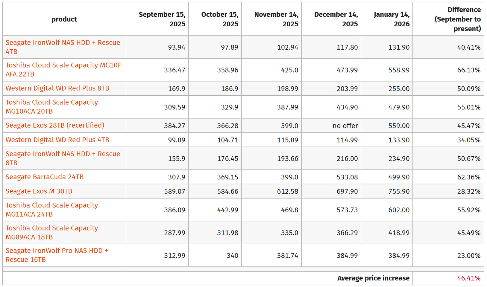 Et malheureusement, les disques durs ne sont pas épargnés non plus si l’on en croit une étude réalisée par le média allemand ComputerBase. Ce dernier révèle que le prix des disques durs a augmenté en moyenne de 46% depuis la mi septembre.