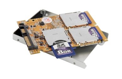 L’engin, plutôt bien pensé, est en fait capable d’accueillir plusieurs cartes mémoires SDHC (Secure Digital High Capacity). Grâce à l’emploi d’un système de type RAID0 la capacité de chaque carte mémoire est cumulée et permet d’obtenir un semblant de SSD.