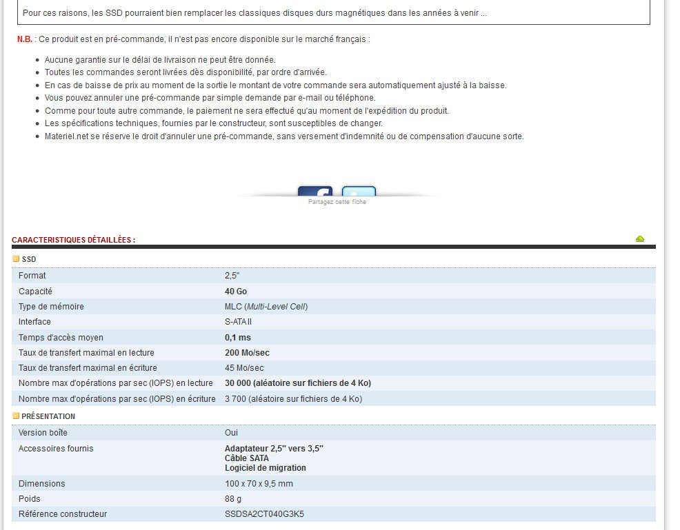 Dans un premier temps, toute la gamme de disques a été annoncée sur le site comme disponibles en précommande. Mais les pages ont rapidement été désactivées. Heureusement, nous avons eu le temps de faire une capture de la page qui concernait le modèle de 40 Go.
