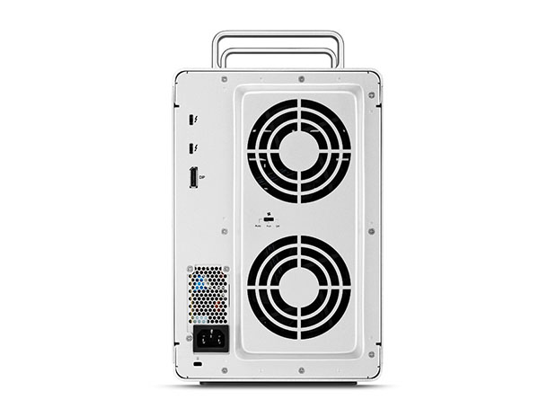 Le D8 Thunderbolt 3 est un système de sauvegarde assez imposant qui se présente sous la forme d’une tour qui mesure 266 mm (haut) x 184 mm (large) x 315 mm (profondeur) et pèse 5,3 kilos. A l’arrière du châssis, on trouve deux ports Thunderbolt 3 à 40 Gb/s et un DisplayPort 1.2.