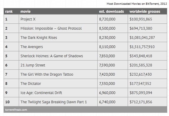 Le film Projet X remporte tous les suffrages avec 8,72 millions de téléchargements. Suivi de Mission Impossible / Protocole Fantôme avec 8,5 millions de téléchargements, The Dark Knight Rises (8,23M), The Avengers (8,11M), Sherlock Holmes 2 (7,85M), 21 Jump Street (7,59M), The Girl with the Dragon Tatoo (Millenium : Les hommes qui n’aimaient pas les femmes en VF) (7,42M), The Dictator (7,33M), Age de Glace 4 (6,96M), et enfin : Twilight 4 – 1ère partie avec 6,74 millions de téléchargements.