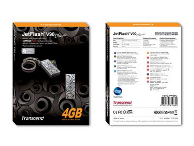 La JetFlash V90C (C pour classic) se présente sous la forme d’un porte clé. Elle offre non plus une capacité de stockage de 2Go mais de 4Go. Ses mensurations sont de 33,8mm x 13,1 mm x 4,5mm pour un poids d’environ 7 grammes.