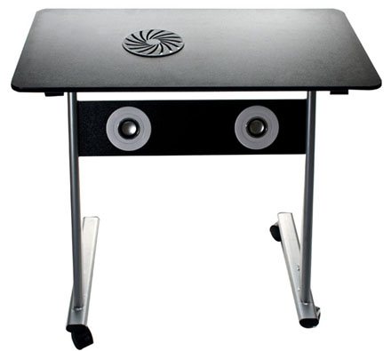 Premièrement on trouve, intégré au plateau du bureau, un ventilateur servant à refroidir votre machine. Sous le bureau, deux enceintes stéréo permettent de restituer un son de meilleure qualité que les enceintes intégrées à votre PC ou à votre notebook.