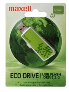 Maxell propose une clé usb écologique : la Eco Drive. D’après le constructeur, cette clé offre la particularité d’être conçue en matière recyclable. D’ailleurs, l’emballage et même la coque de la clé seraient 100% bio dégradable et fabriquaient à base de papier recyclé.