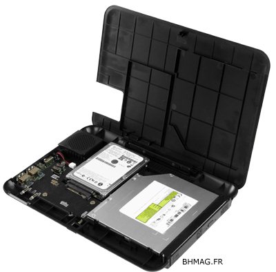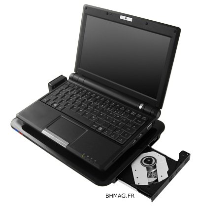 Le IcyBox IB-DK210, c’est le nom de cette station d’accueil, vient prendre place sous le netbook et permet de doter son appareil d’un disque dur additionnel et même d’un graveur. Un emplacement pour disque dur (ou SSD) au format 2,5 pouces est en effet disponible, tout comme un emplacement pour graveur CD, DVD ou Blu-ray au format slim.