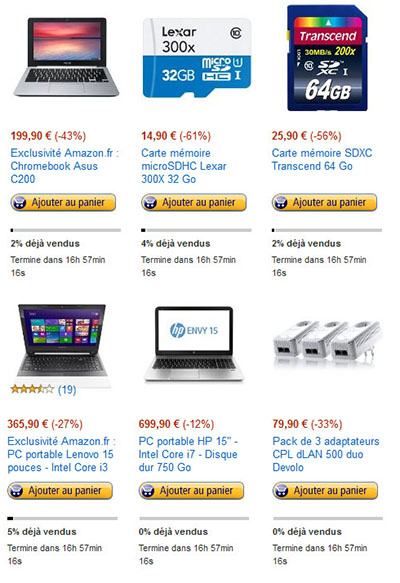 Nouvel arrivage de ventes flash sur Amazon.fr avec cette fois ci une carte mémoire micro SDHC, une SDXC, un pack de 3 CPL Devolo, un Chromebook et deux PC de 15 pouces.