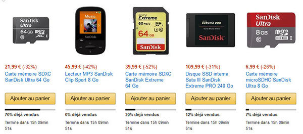Ce matin, le stockage est à l’honneur sur Amazon.fr où plusieurs produits de stockage de marque SanDisk sont en promotion. Il s’agit d’offres éclair limitées en terme de durée et de quantités. Une fois le délai dépassé ou le quota atteint, l’offre est immédiatement retiré. Ne tardez donc pas trop si l’un des produits ci-dessous vous intéresse :