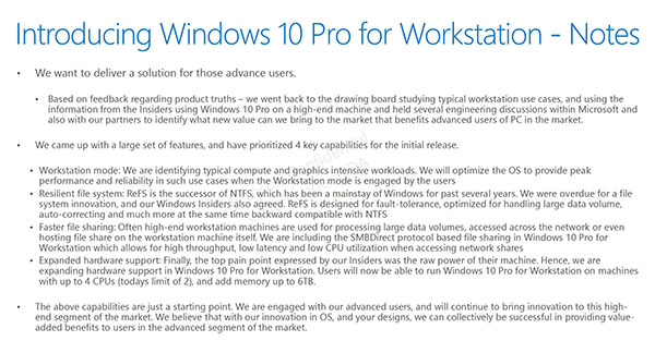Le système d’exploitation supporterait par ailleurs le nouveau système de fichiers ReFS de Microsoft, plus performant que le NTFS dans la gestion de gros volumes de données. Le protocole SMBDirect serait aussi pris en charge afin d’accélérer les transferts de données entre plusieurs machines. Enfin, « Windows 10 Pro for Advanced PCs » serait capable de prendre en charge des machines équipées de quatre processeurs et d’une grosse quantité de mémoire vive (jusqu’à 6 To !).