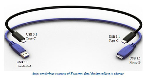 Le connecteur USB 3.1 de type C dont on parlait déjà dans cette actualité en décembre dernier fait à nouveau parler de lui. Plusieurs vues d’artiste réalisés par le fabricant Foxconn viennent en effet d’être publiées ; elles laissent apparaître un connecteur plus fin et plus compact, qui offre en outre la particularité d’être réversible, ce qui devrait simplifier le branchement des appareils et des clés usb.