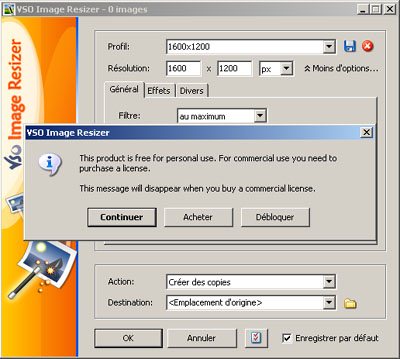 Seul ombre au tableau de cette version 2, l’affichage d’une fenêtre à chaque lancement du logiciel rappelant que le programme est gratuit uniquement pour un usage personnel et non commercial. Une fenêtre qui, il faut bien l’avouer, devient vite énervante au bout de plusieurs utilisations du programme. Une décision qui ne plaît apparemment pas aux utilisateurs de VSO Image Resizer à en croire les messages envoyés au support technique de l’éditeur et même sur son forum.