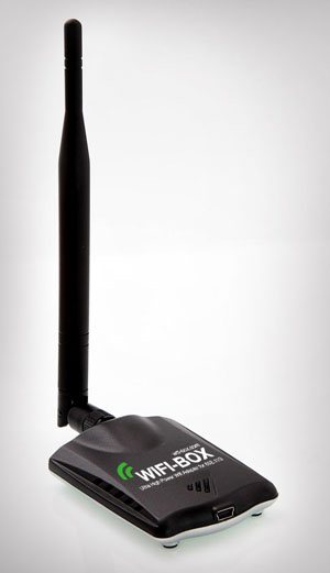 En effet, aujourd’hui, les choses ont changé et il semblerait qu’un véritable appareil de ce genre ait vu le jour : la Wifi Box, un adaptateur Wifi à connecter au port usb de son PC. Equipé d’une puce Realtek RTL8187L, l’adaptateur est doté d’une antenne amovible capable d’offrir une puissance de 6dBi.