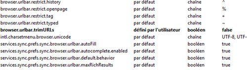 2- Puis rendez-vous à la variable browser.urlbar.trimURLs