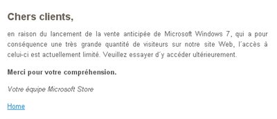 MAJ : le Microsoft Store semble à nouveau rencontré des problèmes d’accès. A l’heure où est publiée cette actualité (14h10) le site est à nouveau saturé par un trop grand nombre de connexion. Le site mentionnant d’ailleurs « Chers clients, en raison du lancement de la vente anticipée de Microsoft Windows 7, qui a pour conséquence une très grande quantité de visiteurs sur notre site Web, l´accès à celui-ci est actuellement limité. Veuillez essayer d´y accéder ultérieurement. Merci pour votre compréhension. Votre équipe Microsoft Store » (cf. la seconde capture ci-dessous)