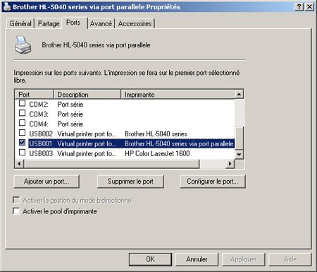 Un petit tour dans les Propriétés de l’imprimante puis dans l’onglet « Port » permet de vérifier que l’imprimante est bien installée.