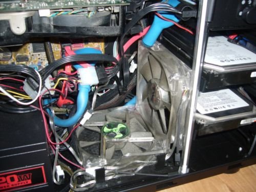 La cage à disques durs peut contenir jusqu’à cinq disques durs. Elle dispose d’origine d’un ventilateur soufflant de l’air frais dans la cage, mais pour augmenter le flux d’air il est possible de rajouter un ventilateur à gauche de la cage comme sur la photo ci-dessous. Il peut être fixé très facilement via deux vis à la cage à disques durs.