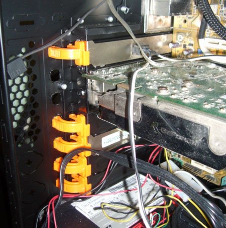 On peut voir ici le système de fixation des baies PCI, qui ne paraît utile que pour de petites cartes (interrupteur de néons, rhéobus, port USB, etc.). Le système semble inapproprié pour une carte graphique par exemple, car la carte n’est pas suffisamment maintenu au châssis. A tel point que j’ai dû revenir à la bonne vieille méthode des boitiers qui date de 10 ans, à savoir : utiliser une vis pour fixer la carte graphique au boitier.
