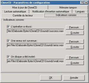 Sons : Les effets sonores utilisés par CloneCD peuvent également être personnalisés. En effet, étant donné que chaque bruitage correspond à une opération du logiciel, il est donc possible de spécifier un autre fichier sonore au format WAV pour chacune des 3 opérations de CloneCD. A savoir : l’opération a réussi, une erreur est survenue et enfin un disque a été inséré.