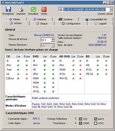 Les informations techniques Les informations suivantes sont extraites des logiciels Nero 8.1.1.4 et NeroInfoTool 5.1.0.0, disponibles tous deux dans notre section Téléchargement.