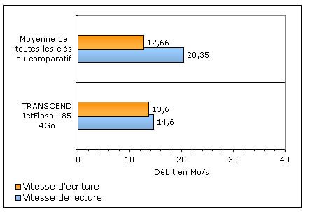 Sur le graphique ci-dessous, les débits (HD Tach) obtenus par le JetFlash 185 sont comparés à la moyenne des clés usb de ce comparatif :