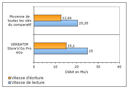 Sur le graphique ci-dessous, les débits (HD Tach) de la clé Verbatim Store’n’Go Pro sont comparés à la moyenne des clés usb de ce comparatif :