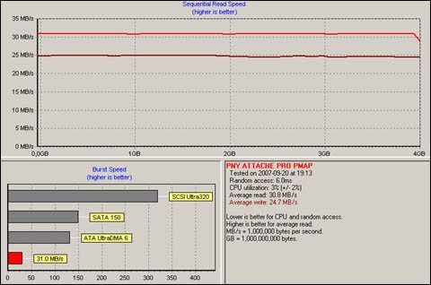 Nos tests réalisés sous HDTach ont révélé un débit de 24,7Mo/s en écriture et de 30,8Mo/s en lecture.