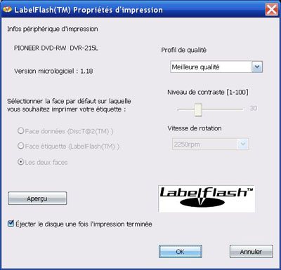 Pour le logiciel d’impression, je me suis contenté d’utiliser Nero 8. Un module spécifique dédié au Labelflash est inclus dans Nero Burning ROM. J’ai choisi d’imprimer la photo d’un paysage : mer, ciel bleu, bateau, les vacances quoi…