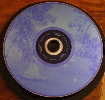 J’ai eu du mal à prendre ces photos, le disque Labelflash étant très brillant, comme un miroir (contrairement aux disques Lightscribe qui sont mats). Les conditions d’éclairage font varier l’aspect du disque. Le disque imprimé est entièrement bleuté, plus ou moins foncé selon les zones de l’image.