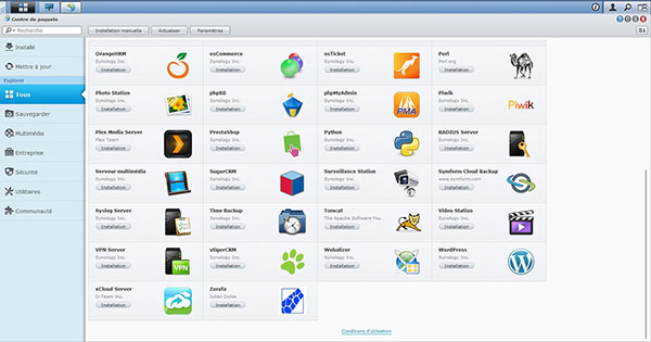 DSM, à la façon d’un Ubuntu ou d’un Google Play intègre un gestionnaire d’applications qui, si le NAS est relié à internet, vous permet de télécharger et d’installer une multitude de paquets, permettant encore d’étendre les capacités de l’appareil.