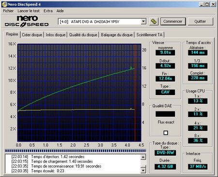 La lecture de notre DVD-RW de test démarre cette fois en 4,92x et prend fin en 12,04x. La vitesse de lecture moyenne est de 9,01x.