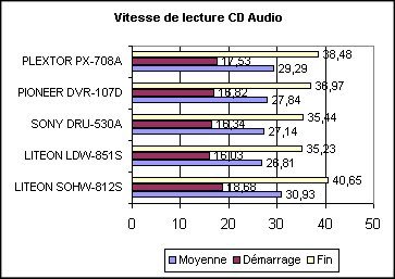 Comme vous pouvez le voir ci-dessous, en lecture de CD-ROM le SOHW-812S de LITEON se révèle légèrement plus performant que le modèle LDW-851S ou le SONY DRU-530A. Le PIONEER DVR-107D et le PLEXTOR PX-708A restent malgré tout mieux placés avec des performances légèrement supérieures.