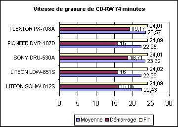 Les fabricants ont fait de nets progrès en gravure de CD-RW, si bien que les performances des différents graveurs sont désormais très proches lors de l’écriture de médias CD-RW. Tous les graveurs comparés ici disposent d’une vitesse d’écriture de 24x pour les CD-RW. A noter que les PLEXTOR PX-708A et SONY DRU-530A s’en tirent malgré tout très légèrement mieux (cf. la vitesse d’écriture moyenne) grâce l’utilisation de technologie CLV contrairement aux autres modèles qui eux exploitent la technologie ZoneCLV.