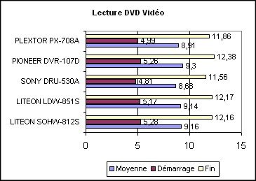Le SOHW-812S dispose de performances très proches du LITEON LDW-851S lors de la lecture de médias DVD. Le PIONEER DVR-107D n’a pas de crainte à avoir dans ce domaine et reste en tête en atteignant une vitesse de pointe de 12,38x et une vitesse moyenne de 9,30x.