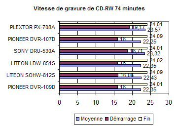 A la vue de ce graphique, il faut reconnaître que les performances entre ces différents sont très proches. Les six graveurs atteignent sans problème la vitesse maximale recommandée par le fabricant : 24x. Néanmoins force est de constater que certains modèle s’en tirent mieux grâce à une vitesse d’écriture moyenne supérieure à la concurrence. Cela est rendu possible grâce à l’utilisation de la technologie CLV dans le cas du PLEXTOR PX-708A et du SONY DRU-530A alors que les autres modèles se contentent de la technologie ZoneCLV.